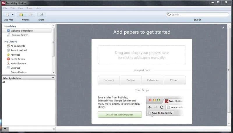 Mengunduh dan memasang aplikasi ini sangat mudah dan sederhana. Setelah pemasangan, buat akun dengan memasukkan alamat email dan kata sandi, serta sebutkan bidang penelitian dan status Anda. Verifikasi email dan buka Dasbor. Anda dapat mengakses Perpustakaan Saya, Makalah, Grup, dan kontak. Bilah alat dan panel navigasi memungkinkan Anda menyinkronkan konten dengan server dan kontak lainnya. Anda dapat mengatur dokumen dengan mengeklik opsi Tambahkan Dokumen atau cukup gunakan opsi seret & lepas.